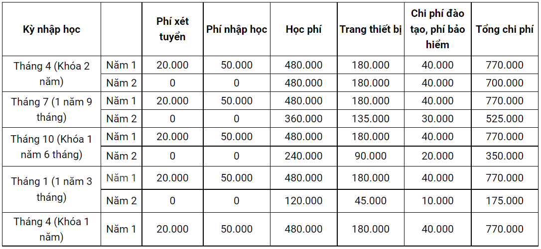 - Kỳ nhập học: Tháng 4, tháng 7, tháng 10 và tháng 1
