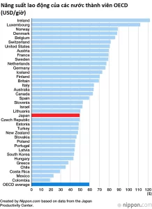 Lao động nhiều là vậy nhưng năng suất của Nhật lại đi lùi khi năm 2000, năng suất lao động Nhật Bản chiếm khoảng 70% nếu so sánh với lao động Mỹ thì con số này những năm gần đây chưa được 60%.