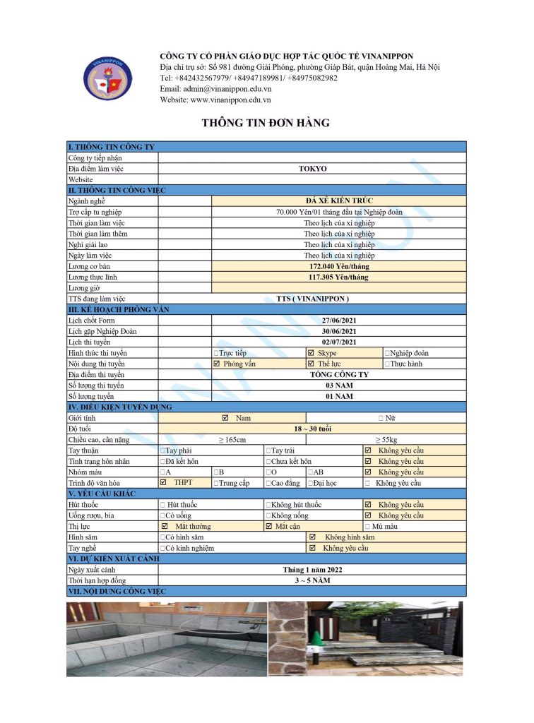 Tuyển 03 NAM đơn hàng “ĐÁ XẺ KIẾN TRÚC – TOKYO” thi tuyển ngày 02 tháng 07 năm 2021