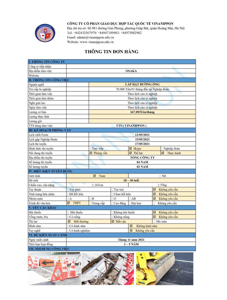 🌻TUYỂN DỤNG XKLĐ NHẬT BẢN “LẮP ĐẶT ĐƯỜNG ỐNG – OSAKA”