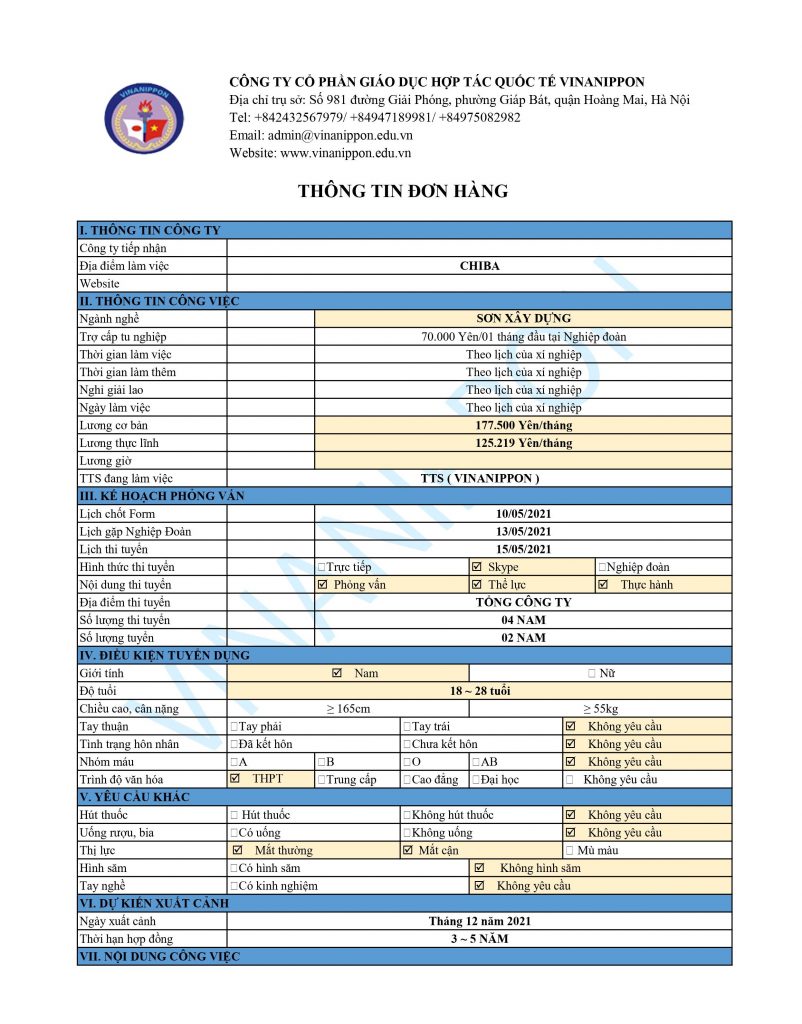 Tuyển 04 NAM đơn hàng “SƠN XÂY DỰNG – CHIBA” thi tuyển ngày 15 tháng 05 năm 2021