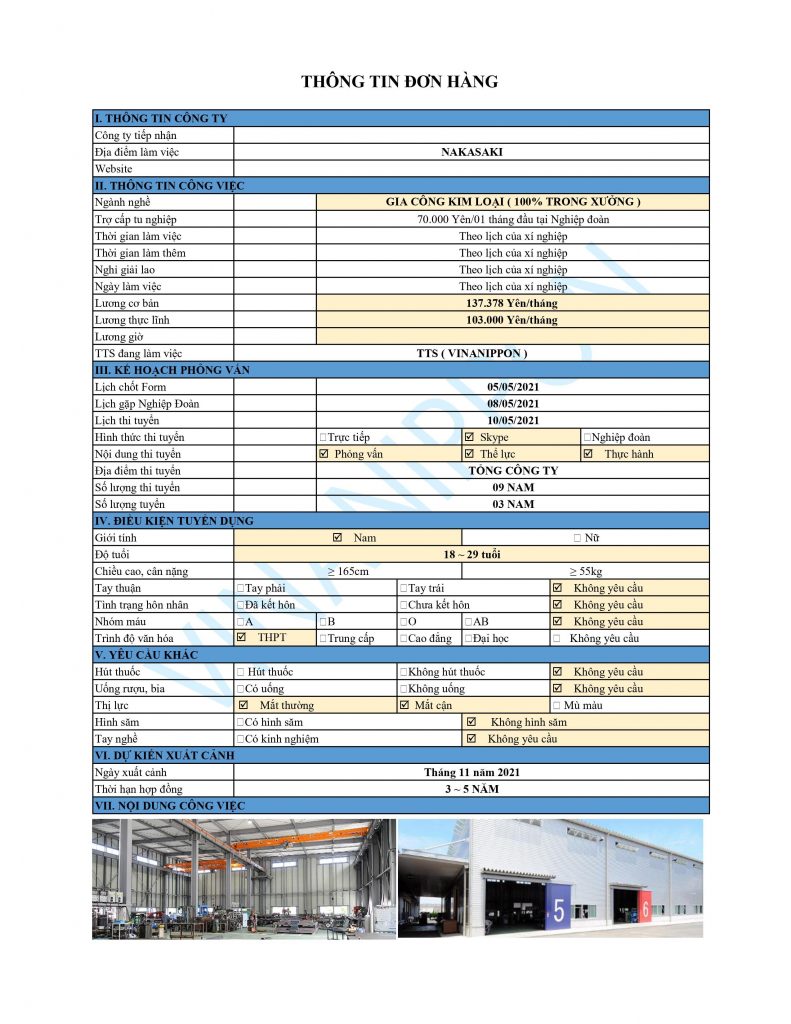 Tuyển 09 NAM đơn hàng “GIA CÔNG KIM LOẠI – NAKASAKI” thi tuyển ngày 09 tháng 04 năm 2021