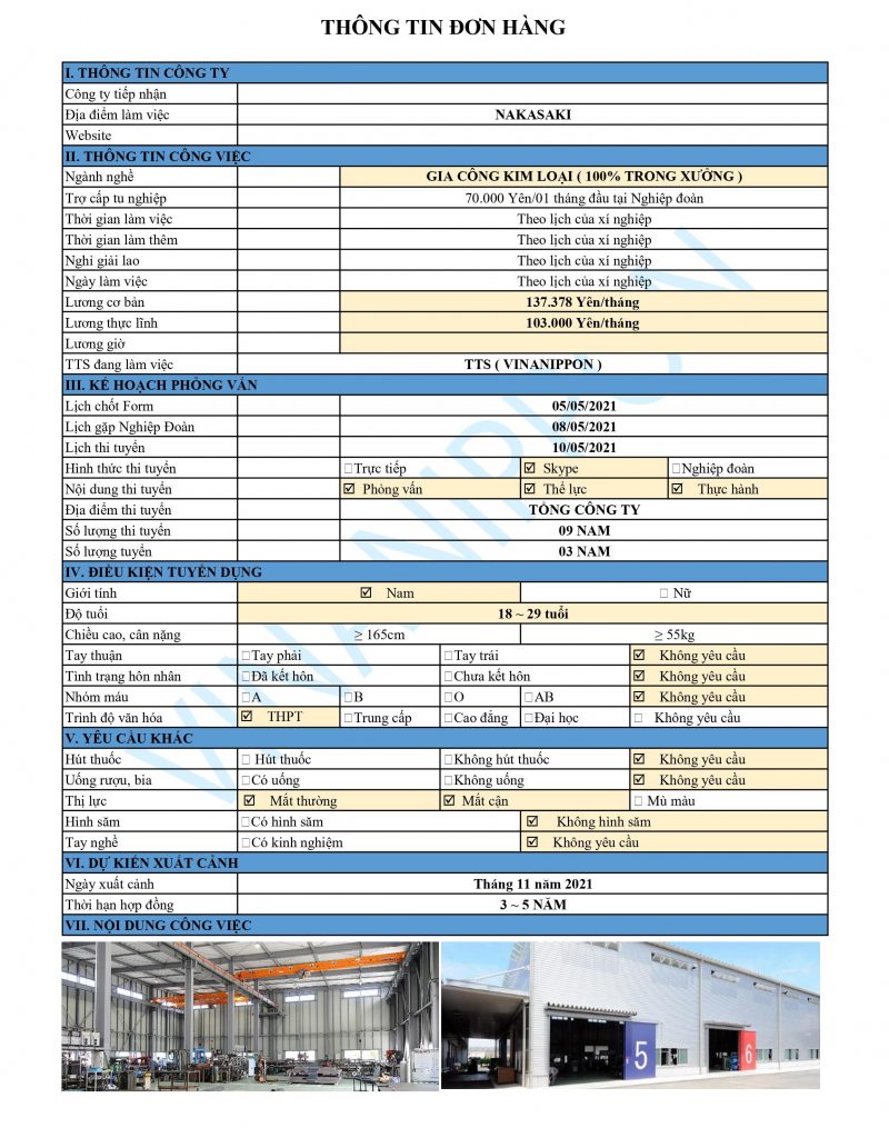 Tuyển 09 NAM đơn hàng “GIA CÔNG KIM LOẠI – NAKASAKI” thi tuyển ngày 10 tháng 05 năm 2021