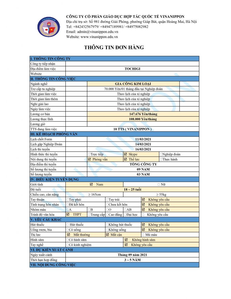 🌻TUYỂN DỤNG XKLĐ NHẬT BẢN “GIA CÔNG KIM LOẠI ( LÀM TRONG NHÀ MÁY) – TOCHIGI”